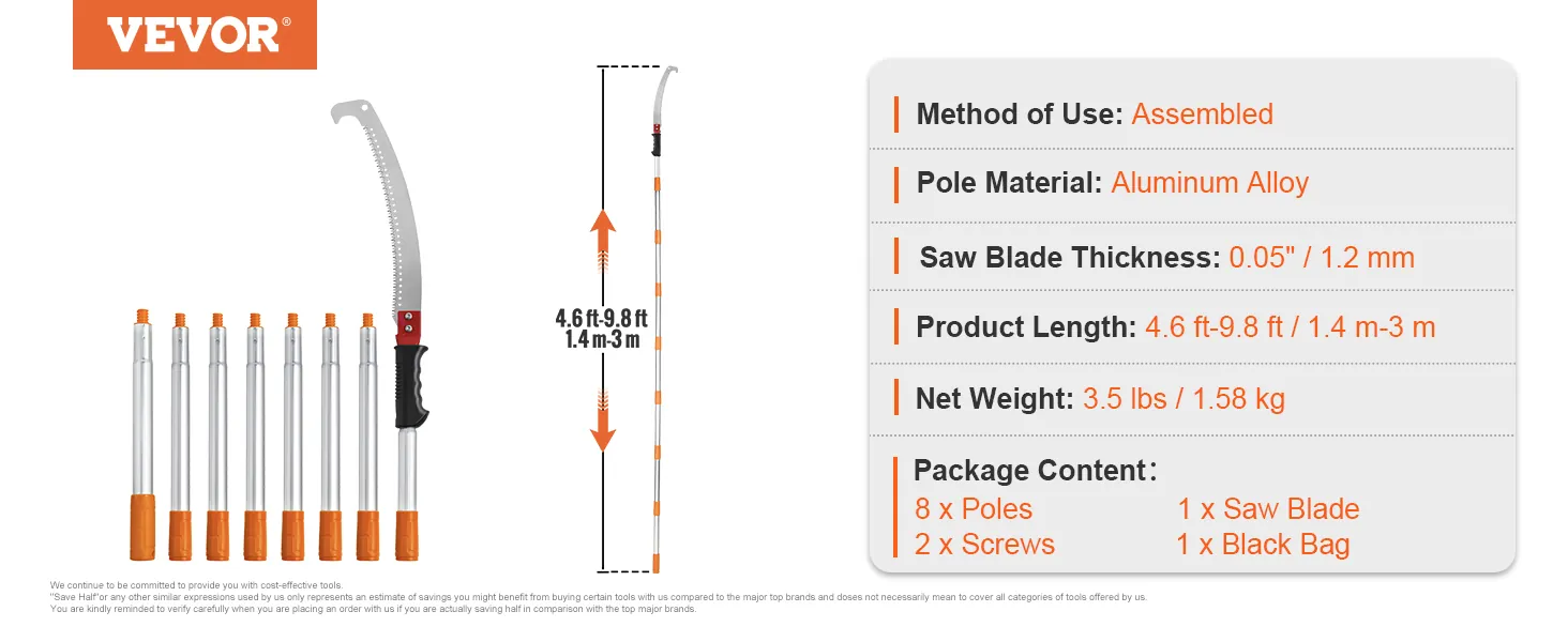 Висувна пила для дерев VEVOR розрахована на висоту різу від 1,4 до 3 метрів. Оснащена гострим лезом для ефективного різання, міцним з'єднанням та 8 знімними стрижнями для роботи на висоті. Призначена для обрізання високих гілок, але також може використовуватися як ручна пилка для обрізання нижніх гілок, кущів і стволів. Оснащена подвійним замикаючим механізмом, який робить замикання легким та безпечним. Цей інструмент, вагою 1,58 кг, можна використовувати протягом тривалого часу, не викликаючи втоми. Лезо оснащене гачковим ножем зверху для видалення гілок при втягуванні. Зручна ручка та з'єднання стрижня виготовлені з ізоляційного матеріалу для забезпечення безпеки під час використання. Крім того, посилені гвинти забезпечують стійкість між пилкою та шиною і запобігають розхитування та можливих травмах. У комплекті йде сумка для зберігання всіх аксесуарів, щоб вони не загубилися.